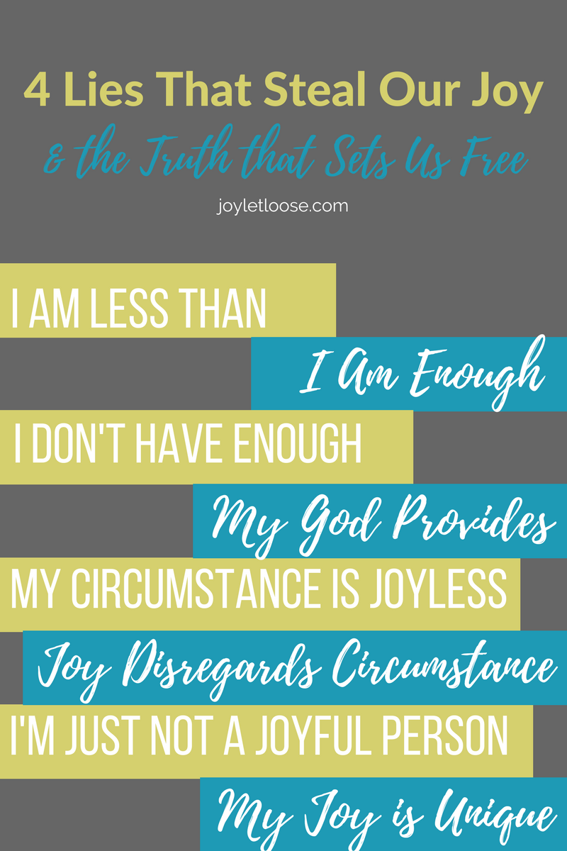 At  Joy Let Loose, we passionately pursue the kind of life that explodes with joy. So we want to help identify 4 Lies that Steal Our Joy (& the Truth that Sets Us Free.) It takes practice, and often a whole lot of accountability, to recognize, name, and replace the lies. But I promise you that freedom and joy lie on the other side!